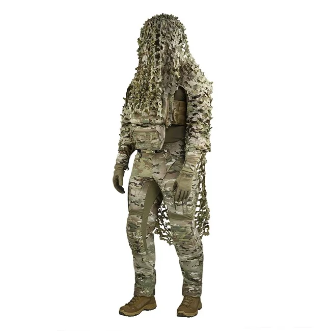 La combinaison de camouflage se compose de deux parties : une veste à manches et capuche, et une cape amovible à deux épaisseurs faisant office de cape et permettant de dissimuler des armes, si nécessaire. La doublure de la veste est en maille de nylon dont la couleur a été spécialement choisie pour une parfaite confondance avec le paysage. La cape amovible est fixée à la base par trois boutons. Pour masquer le visage, une capuche à visière est fournie ; elle peut être portée par-dessus un casque et sa taille est réglable dans deux directions.